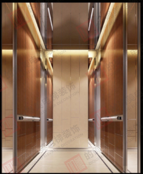 侧壁:中心板木质饰面加不锈钢嵌条;辅助板古铜色镜 。