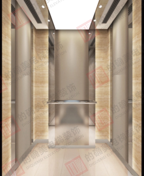 侧壁:中心板镜面不锈钢+喷砂不锈钢;辅助板米黄蜂窝大理石。不锈钢踢脚线