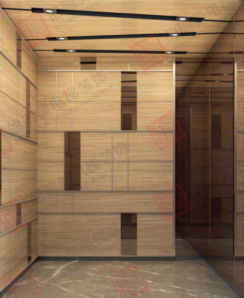 后壁和左侧壁:木质饰面与黑钛、镜面组合嵌发纹装饰条。