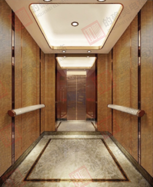 侧壁:木质饰面与玫瑰金镜面不锈钢装饰条。
