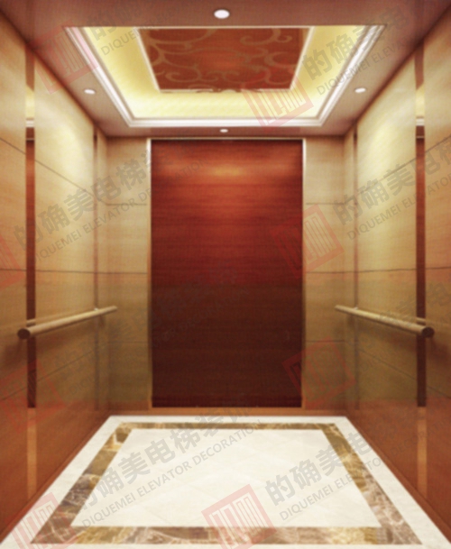 侧壁:木质饰面与镜面不锈钢条;玫瑰金、发纹踢脚线。